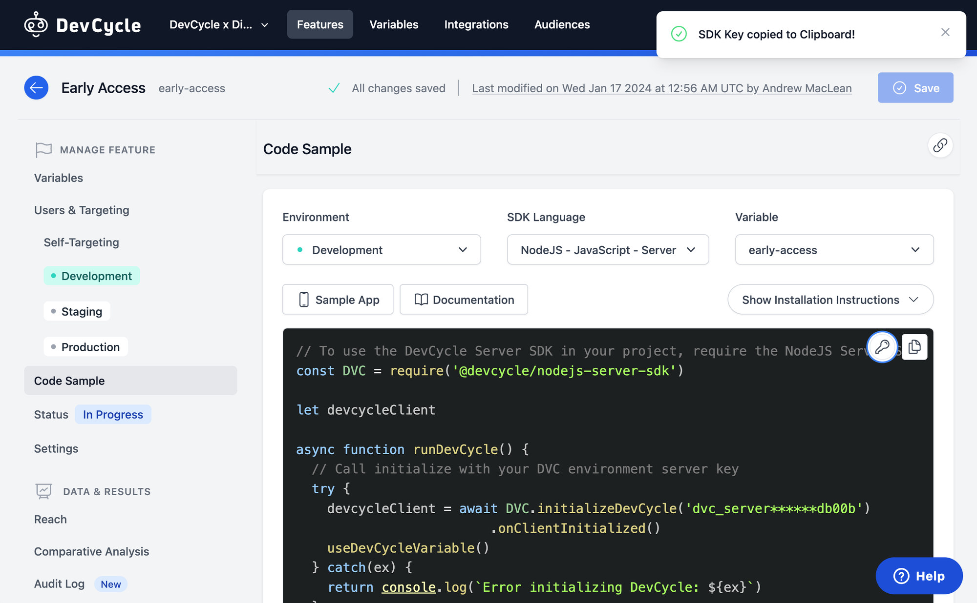 1e. Copy DevCycle SDK Keys