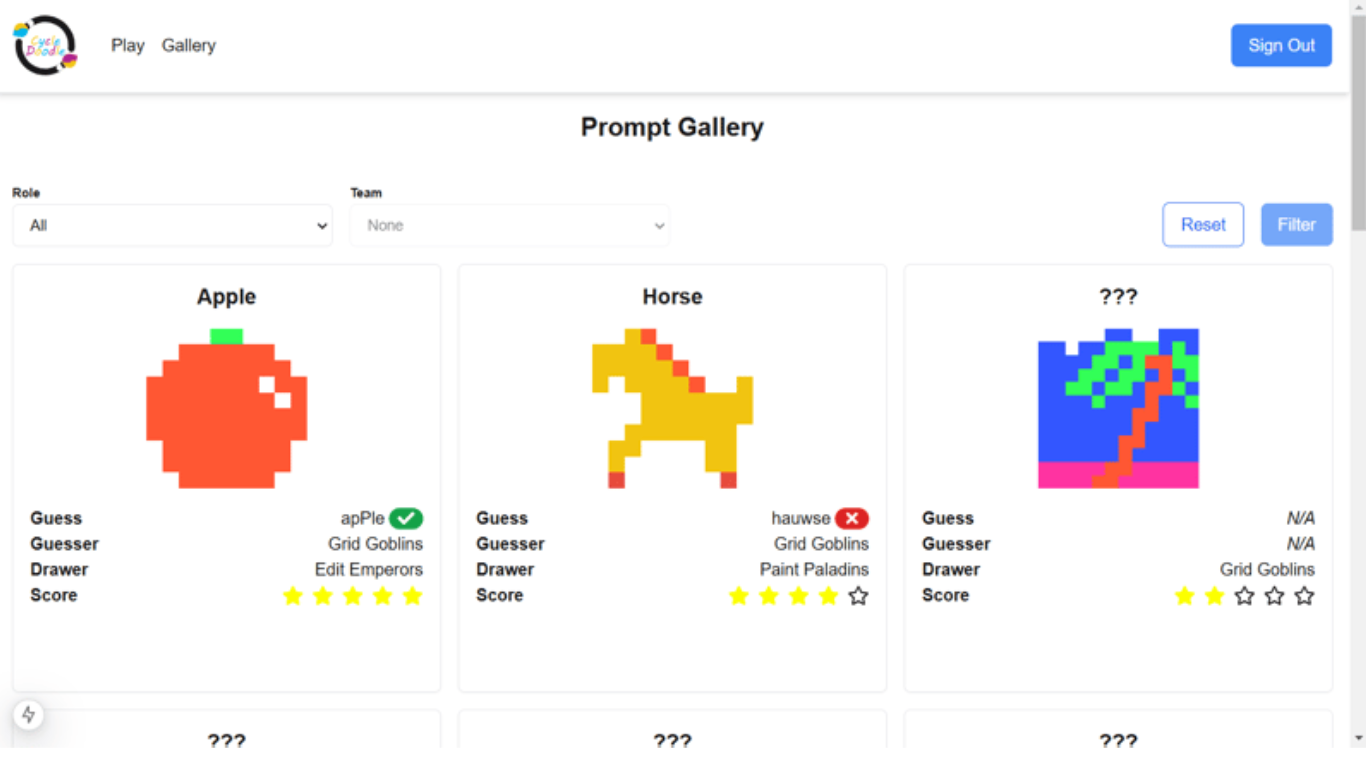 Ansell created a web game that allows users to join one of three teams and either draw a simple image based on a prompt, guess what other teams have drawn or rate the drawings of other teams.